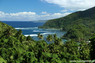 《ツツイラ島 ⑮》 こちらは島の中央部を貫く山脈を隔ててパゴパゴの裏(北側)に当たるバティア(Vatia)に向かう道の途中にある峠から見た島の様子です。 一般的にほとんど熱帯雨林に覆われた島だということがわかります。 |