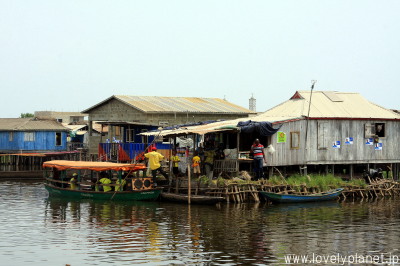 《村の賑わい》 ガンビエが最も大きな村ですが、湖には他にもいくつもの村があり、全部合わせると約3万人の人が住む、アフリカ最大の水上集落群です。 |