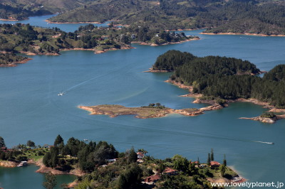 《悪魔の岩からの眺望 ①》 ちょうど中間辺りに位置する展望所からの眺めです。 因みに、下に駐車場が見えますが、グアタペ方面からのミニバスなどはここまで来てくれますが、メデジンからグアタペ行きのバスの乗客は左下の湖畔辺りで降ろされてしまうので、先ほどご紹介した740段プラス駐車場までの登り(約15分)が必要になります。ただし、それがきつい人はバス停から駐車場まで3輪タクシーなどを利用することもできます。 |