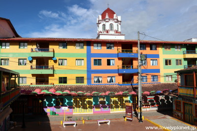 《グアタペ中心部 ①》 グアタペはゆっくり歩いても2時間もあればほとんど見て回れるような小さな町ですが、町全体がカラフルに彩られているので、特に週末には多くの観光客が訪れます。 左の写真はごく普通の集合住宅です。 |