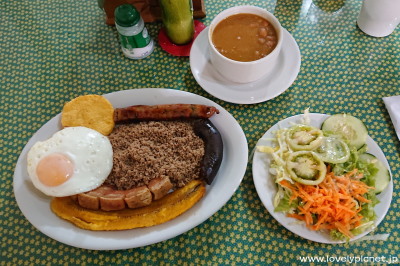 《アンティオキア料理》 ちょうどいい時間になったので公園に面したレストランでランチを食べることにしました。 せっかくアンティオキア情緒溢れる田舎町を訪れていたということで、この地方を代表する郷土料理であるパイサ(Paisa)というセットを頼んだところ出てきたのがこちら。 豆のスープとサラダに加えてメインのさらには左から時計回りに目玉焼き、コロンビアの主食とも言えるアレパ(Arepa)というトウモロコシで作ったパン、豚肉のソーセージ、豚の血のソーセージ、バナナのフライに囲まれた内側には豚の皮のフライ、中央に牛肉のそぼろという内容でした。 酷く美味しいというほどではありませんでしたが、オリジナリティ溢れる地元料理はお腹いっぱいになりました。 |
