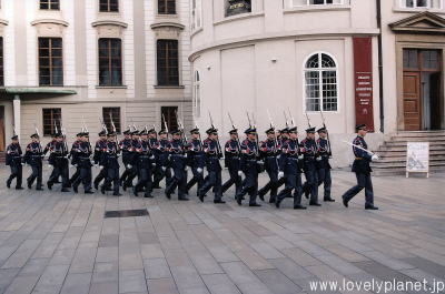 《プラハ城正門の衛兵の交代式 ①》 フラッチャニ広場(Heradčanské nám)に面したプラハ城の正門の脇には2人の衛兵が立っていて、毎正時に交代式が行なわれます。 |