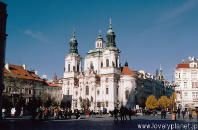 《聖ミクラーシュ教会》【世界遺産】 こちらも旧市街広場に建つ、ティーン教会とは対照的な白壁が美しいバロック様式の教会です。 |