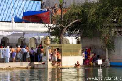 《黄金寺院で沐浴 ①》 中央の人口池は「アムリタ・サラス」(不死の池の意)と呼ばれています。 ラムガール·ブンガの前にはガート(Ghat、沐浴場)、があり多くの巡礼者が沐浴を楽しんでいます。 |