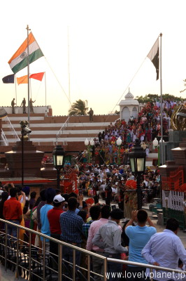 《インド・パキスタン国境 ③》 このセレモニーは、一言で言ってしまえば毎日日没前に国境が閉鎖されるのに伴って両国軍兵士により両国の国旗が降ろされるだけのものなのですが、どういうわけか両国内に観客席が設けられ、一大イベントとなっているのです。 |