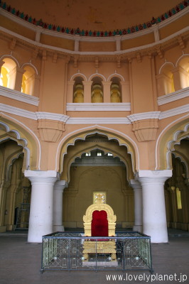 《マドゥライ ㉒》 中央のホールは当時謁見の間だったそうで、黄金の玉座が展示されていて、セレブ感たっぷりのインド人が興味深そうに写真を撮ったりしていました。 |