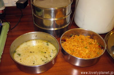 《ある日の夕食 ②》 このホテルは1泊US$30程度と少し高級だったので、上の写真のような白い保温容器に入った5段重ねの金属の弁当箱のようなものに盛り付けられてうやうやしく運ばれてきました。 ここのレストランは南インドにありがちなベジタリアンレストランで左がガーリック・スープ、右が四川炒飯(ほとんどビリヤニ)という内容でしたが、どちらも(いつも通り量が多いのはもちろん)驚くほど美味しくてびっくりしました。 これで合わせて400円足らずというのだからインド旅行はやめられません。 |