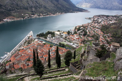 《コトル湾岸に広がるコトルの町と途中の教会》【世界遺産】 旧市街から裏の城壁への階段を登っていくと、とても美しい景色を楽しむことができます。 |