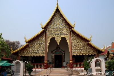 《ワット・パンタオ ③》 本堂内部は床も壁も含めてすべてチーク材で建てられているため、日本人には親しみやすい雰囲気を醸し出していると言われています。 |