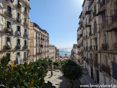 《アルジェ中心部 ⑧》 旧市街のカスバ(Casbah、アラビア語で「城塞」という意味。アルジェでは城壁に囲まれた旧市街中心部を指します)へと続く階段の途中から港方面を見た様子です。 歴史を感じさせる建物と海のコントラストがとても美しいです。 |