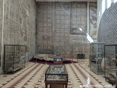 《ジェミラ遺跡 ③》【世界遺産】 モザイク画は、ほとんどがもともとは床に描かれていたものを、見やすいように壁に張られています。 |