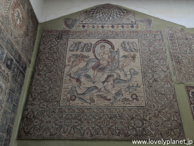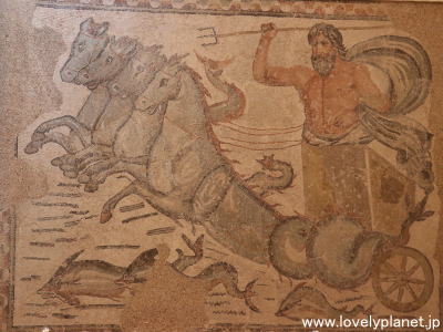 《ティムガッド遺跡 ⑩》【世界遺産】 ジェミラ同様、この遺跡からも多くのモザイク画が発掘されていて入口近くの博物館に展示されています。 左の写真は「ネプトゥーヌスの凱旋」と呼ばれるモザイクです ローマ神話の海の神であるネプトゥーヌス(ポセイドンのローマ名)が、海獣(ヒッポカムポス)が引く戦車に乗っている様子を描いているそうです。 |