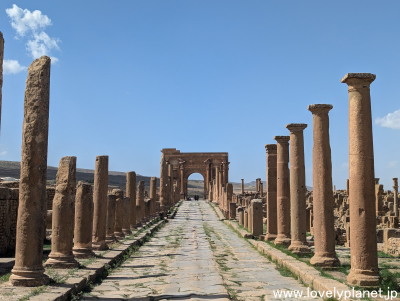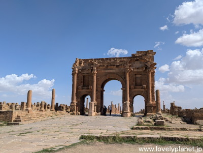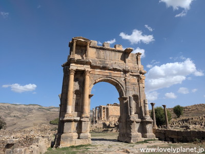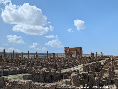 《ティムガッド遺跡 ①》【世界遺産】 翌日は、コンスタンティンの約120km南にあるティムガッド(Timgad)遺跡を訪問しました。 西暦100年頃にトラヤヌス帝によって建設されたこの都市は、ローマ帝国時代の都市計画の優れた例として知られています。 |