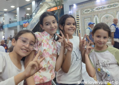 《コンスタンティン空港 ③》 そんな中、ベンチに座ってチェックイン時間を待っていると、とにかく大勢の子供たちがあからさまに好奇の視線を向けながらこれ見よがしに私たちの席を中心にちょろちょろと(というかぐるぐると)駆け回っていたのですが、遂にそのうちの4人組のグループが根負けして「写真を撮って頂戴」と言ってきたので、喜んで撮ってあげました。 |