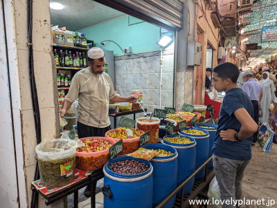 《ガルダイアの市場 ③》 オリーブや漬物の店が目立ちます。 |