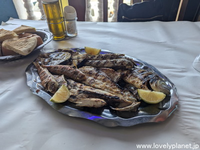《シェルシェル ③》 今回オーダーしたのは魚のグリルの盛り合せです。 写真では判りづらいですが、結構なボリュームです。 魚はどれも非常に新鮮で美味しかったですが、塩とライムだけのシンプルな味付けだったのでさすがに途中で飽きてしまい、海外旅行の際には肌身離さず持ち歩いている醤油を少しかけて何とか完食しました。 付け合わせがパンでなくライスだったらもっと美味しく頂けたと思い、ほんのちょっぴり残念でした。 |