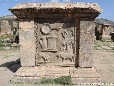 《ジェミラ遺跡 ⑰》【世界遺産】 ただ、近くにあった祭壇のレリーフには、生贄の儀式の場面がきれいに残されています。 |