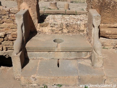 《ティムガッド遺跡 ⑨》【世界遺産】 中央の一段高いところ(上の写真の中央左寄り)にひときわ大きな便座がありました。 イルカの形をした肘掛けが特徴です。 VIP席のような感じでしょうか。 下々の人々の営みを上から眺め降ろすというのは気持のいいものかもしれませんが、皆に見られながら用を足すというのも格別な気分だったのでしょうか。 |
