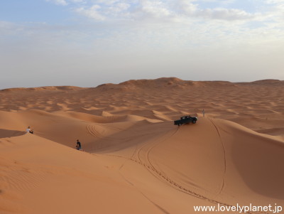 《サハラ砂漠観光 ②》 同じゲストハウスで過ごしたのは私たちの他に2名だけでしたが、現地に着くと10台ほどの車(20名ほどの観光客と、同じく20名くらいの地元ガイド)が既に到着していました。 どうやらここは広いサハラ砂漠の中でも定番のスポットのようです。 |