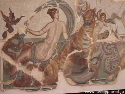 《ジェミラ遺跡 ⑨》【世界遺産】 上の大きなモザイク画の左部分です。 円形の枠の中に様々な人物や動物が細かく描写されています。 |