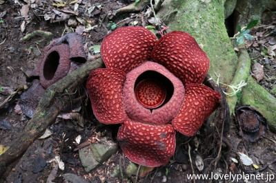 《ブキティンギ近郊ツアー ③》 ラフレシアの花は最大で直径90cm程にも達し、「世界最大の花」としてよく知られていますが、花を咲かすのには2年かかるのに、花が咲いたら約3日で枯れてしまうので、目にすることは難しいと言われています。 |