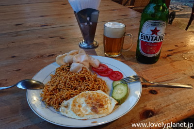 《インドネシアの食事 ①》 その後、中心部のレストラン(New Monalisa)ではミーゴレン(焼きそば)を食べました。 ただ、インドネシアの多くのレストランでは乾麺(ほとんどの場合、日本のカップ焼きそばのような油揚げ麺)を使っているのに対して、この店は生麺を使った中華風で、私が今まで海外で食べた焼きそばの中では指折りの美味しさでした。 なお、ブキティンギ(というかスマトラ島全般)は厳格なイスラム教徒が多いのでビールを置いてある店は少ないです。 その点からも、この料理はミーゴレンではなく、中華系の経営者によるChow Meinだったのだと思います。 |