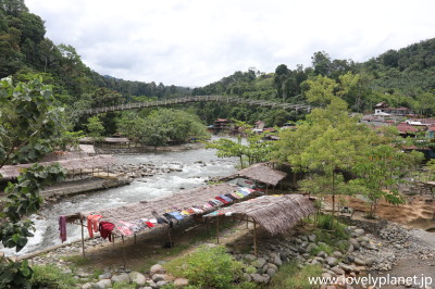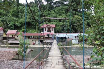 《ブキッ・ラワン ⑧》 吊り橋から見た先ほどの通路沿いの町並みです。何だか日本の寂れた小さな温泉街のような風情です。 ただし、こんな小さな村ですが、ここは世界遺産(自然遺産)に登録されたスマトラオランウータンの最大の動物保護区であるグヌンルスル国立公園(Taman Nasional Gunung Leuser)への観光拠点であることからツーリスト(特に欧米からのバックパッカー)が多く訪れるため、川の両側には多くの民宿やロッジが点在しています。 |