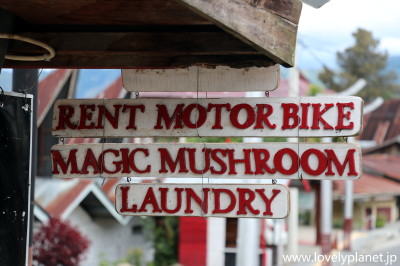 《トバ湖 ⑥》 マジック・マッシュルームの看板を堂々と掲げる店が多いのも往時の面影を偲ばせます。 |