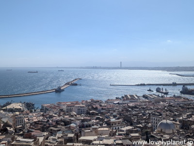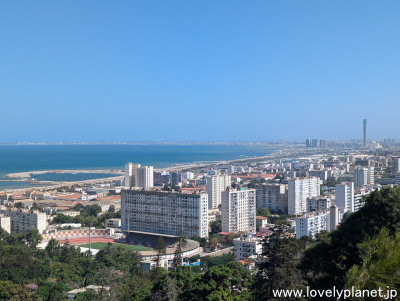 《アルジェ中心部 ⑭》 殉教者記念碑のある丘から東方向(中心部とは逆方向)を見た様子です。 右奥には、アルジェリア最大のアル・ジャザイール・モスク(Djamaa el Djazaïr 又は Great Mosque of Algeria)にある世界で最も高い265mのミナレットが見えます。 15kmほど先にはアルジェ国際空港があります。 |