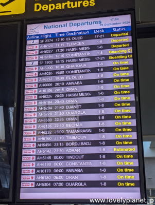 《アルジェ空港》 アルジェ市内の観光を一日楽しんだ後は、夜の便で次の目的地コンスタンティン(Constantine)へ移動するために空港に向かいました。 国内線ターミナルなので当たり前ですがアルジェリア航空の独壇場です。 アルジェリアはアフリカ大陸で最大の面積を持つだけあって(とはいうもののその9割ほどは南部の砂漠地帯ですが)、多くの国内線が飛んでいます。 |