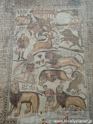 《ジェミラ遺跡 ④》【世界遺産】 このモザイクは、裕福なローマ貴族の邸宅「バッカス神殿の家」の大食堂の床を飾っていたもので、狩猟の様子を描いているものだそうです。 |