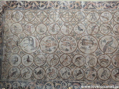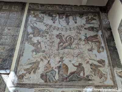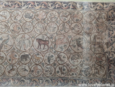 《ジェミラ遺跡 ⑨》【世界遺産】 上の大きなモザイク画の左部分です。 円形の枠の中に様々な人物や動物が細かく描写されています。 |