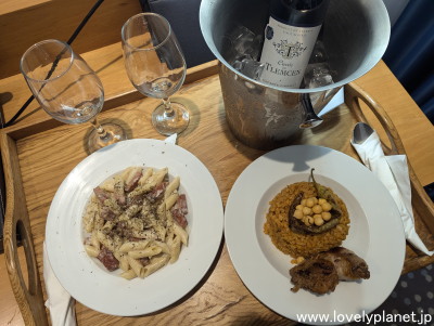 《コンスタンティン ㊱》 この日の夕食はホテルのレストランで食べようと思っていたら何かの会議後のパーティーで貸切ということで仕方なくルームサービスを頼みました。 ビールも飲みましたが、ワインもあったのでボトルを1本オーダーしました。 アルジェリアはイスラム国家で国民の99%がムスリムとのことですが、国産ワインも醸造しています。 普通に美味しかったです。 |