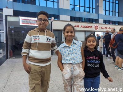 《コンスタンティン空港 ③》 そんな中、ベンチに座ってチェックイン時間を待っていると、とにかく大勢の子供たちがあからさまに好奇の視線を向けながらこれ見よがしに私たちの席を中心にちょろちょろと(というかぐるぐると)駆け回っていたのですが、遂にそのうちの4人組のグループが根負けして「写真を撮って頂戴」と言ってきたので、喜んで撮ってあげました。 |