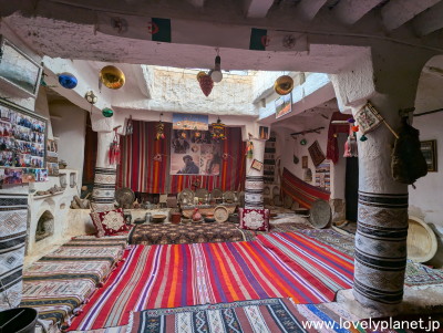 《ガルダイア ⑧》【世界遺産】 ガイドの案内で、あるお宅の内部を拝見させて頂きました。 とてもカラフルでチャーミングです。 こちらは、東の隣国リビアのガダーミスで見せて頂いた家の内装と雰囲気が少し似ています。 |