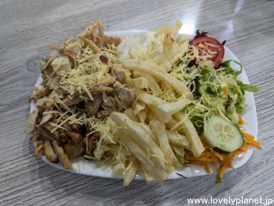 《ある日の昼食》 この日の昼食は地元のファーストフード店で好きなものを頼みました。 特に好きなものはありませんでしたが、世界中どこでもお馴染みで、この地域でもポピュラーなドネルケバブプレートを食べました。 写真では大きさは判りづらいかもしれませんが、これで普通に2人前はあって値段は450円ほどです。 普通に美味しかったです。 |