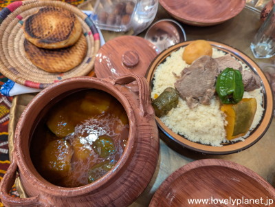《アルジェリアの伝統料理》 この日の夕食はムザブの伝統的な家庭料理をご馳走になりました。 ラクダの肉のスープをクスクスにかけて頂きます。 スープは意外と甘みが強かったですが、とても美味しかったです。 |