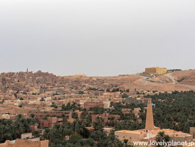 《ガルダイア ①》【世界遺産】 Ghardaiaの空港へは23時過ぎに到着し、市街地中心部のホテルまでは旅行会社に手配してもらっていた車で移動して、24時過ぎに無事にチェックインしました。 やっぱりツアーは便利ですね。 翌日、朝起きると、ホテルの部屋のベランダからは美しい景色が広がっていました。 こちらは西方向、ガルダイア中心部の方角です。 |