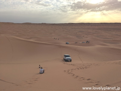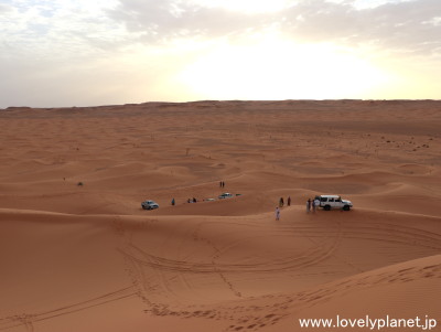《サハラ砂漠観光 ②》 同じゲストハウスで過ごしたのは私たちの他に2名だけでしたが、現地に着くと10台ほどの車(20名ほどの観光客と、同じく20名くらいの地元ガイド)が既に到着していました。 どうやらここは広いサハラ砂漠の中でも定番のスポットのようです。 |
