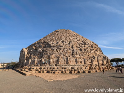 《マウレタニア王家の霊廟》 アルジェに帰りがてら、ティパサの約10km東(アルジェ寄り)に位置する Royal Mausoleum of Mauretania を訪れました。 紀元前1世紀頃に古代ヌミディア王国の王族の墓として建設されたとされています。 高さは約33メートル、直径は約60メートルあるそうです。 丘の上にこの建築物が建っているだけですが、ティパサ遺跡よりも見応えはあるかもしれません。 |