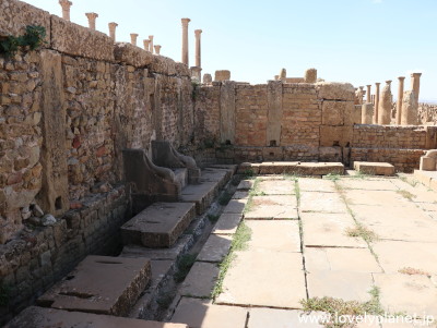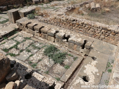 《ティムガッド遺跡 ⑧》【世界遺産】 公衆トイレです。 ジェミラ遺跡にもありましたが、共同で利用する形式で、便座に当たる石の中央の穴の上に座るタイプで、足元の溝は洗浄用の水路として機能していました。 |