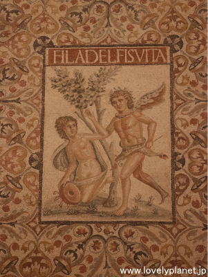 《ジェミラ遺跡 ③》【世界遺産】 モザイク画は、ほとんどがもともとは床に描かれていたものを、見やすいように壁に張られています。 |