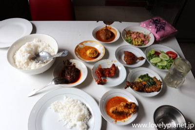 《インドネシアの食事 ④》 更に因みに、この辺りを代表する「パダン料理」はこんな感じで出てきます。 席に着くと、食べ放題のようなライスと共にありったけの料理がテーブルの上に並べられ、そこから好きな物だけ食べて、食べた分だけ精算するという仕組みです。 パダン料理はインドネシア全土でも非常に人気のある郷土料理で、全国どこにでもパダン料理レストランはあります(ただ、他の土地ではこのように並べられることは少なく、1枚上の写真のようにメインディッシュをショーケースから選ぶ(あるいは元々決まっている)のが一般的です)。 |
