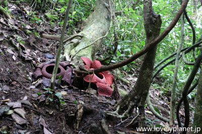 《ブキティンギ近郊ツアー ③》 ラフレシアの花は最大で直径90cm程にも達し、「世界最大の花」としてよく知られていますが、花を咲かすのには2年かかるのに、花が咲いたら約3日で枯れてしまうので、目にすることは難しいと言われています。 因みに左隣には数日前まで咲いていて今はもう枯れてしまった花が見えます。 |