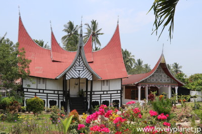 《ブキティンギ ⑥》 敷地内には伝統的なミナンカバウ(Minangkabau、西スマトラに居住する民族集団)建築様式の建物が数棟建っています。 水牛の角のような曲線を描く屋根(ミナンカバウ人には「バゴンジョン」と呼ばれています)が特徴です。 |