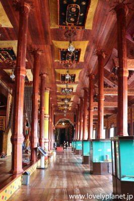 《ブキティンギ近郊ツアー ⑫》 内部は壮大な木造建築で、多くの柱と美しい装飾が特徴です。 ただ、元々この宮殿は17世紀に建てられたとのことですが、現在の建物は1976年に再建されたレプリカが2007年に落雷により焼失し、その後再び再建されたものだそうです。 |