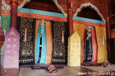 《ブキティンギ近郊ツアー ⑬》 左の写真にに見られるような豪華な黒地の織物には、孔雀や花などの植物をモチーフにした金色の刺繍が施されています。 なお、ミナンカバウ社会は世界最大の母系社会として知られており、土地や家屋などを含め財産は母から娘へと受け継がれるそうです。 |
