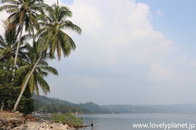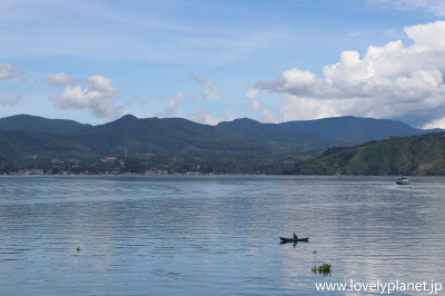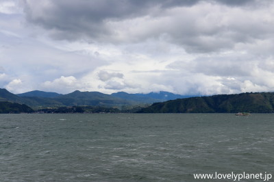 《トバ湖 ①》 ブキッラワンの観光を終えると、翌日には車(乗合いのチャーター車)で8時間ほどかけて、トバ湖(Danau Toba)湖畔の町パラパット(Parapat)に到着しました。 ここから約1時間ボートに乗って、湖の中央に浮かぶサモシール島(Pulau Samosir)に向かいます。 |