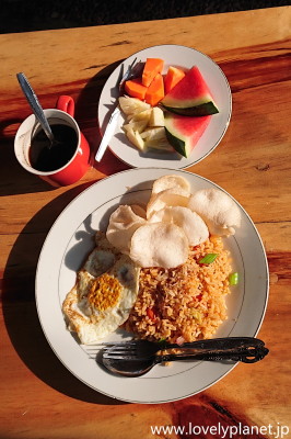 《インドネシアの食事 ⑤》 食事シリーズの最後は、朝食です。 左の写真は今回泊まった宿で出てきたナシゴレン(インドネシア風炒飯)です。 欧米式のトーストなどを出す宿もありますが、大抵ナシゴレンも選べます。 個人的には日本人にはありがたいスタイルの朝食だと思います。 |