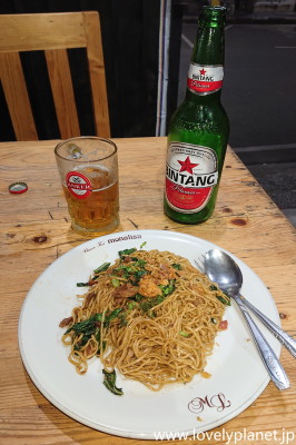 《インドネシアの食事 ①》 その後、中心部のレストラン(New Monalisa)ではミーゴレン(焼きそば)を食べました。 ただ、インドネシアの多くのレストランでは乾麺(ほとんどの場合、日本のカップ焼きそばのような油揚げ麺)を使っているのに対して、この店は生麺を使った中華風で、私が今まで海外で食べた焼きそばの中では指折りの美味しさでした。 なお、ブキティンギ(というかスマトラ島全般)は厳格なイスラム教徒が多いのでビールを置いてある店は少ないです。 その点からも、この料理はミーゴレンではなく、中華系の経営者によるChow Meinだったのだと思います。 |